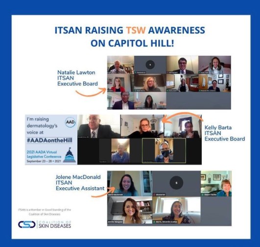 - ITSAN President Kathryn Tullos joined Dr. Peter Lio to present “The Skinny on TSW and Steroids” at the National Eczema Association’s Virtual Eczema Expo on August 28. Discussion included the severe potential side effects of topical steroid use and the need for TSW research, physician and patient education, and safer topical steroid prescribing and monitoring guidelines.