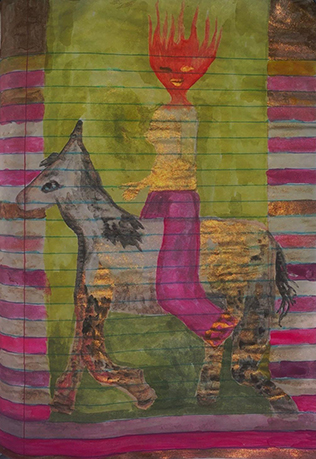 “this painting was in my head for a bit; true story. i was visiting my grandparents in 2018 probably 8 or 9 months into my withdrawal…i had to take a flight (they live in canada, i live in california). traveling with tsw as you all know is so challenging. my skin was burning, flaking, bleeding, i could not stop itching. but my family had decided to go on vacation and it was important for me to go and see my grandparents who i very rarely see. one day during the trip they all decided to go horseback riding. we went on horses together through the forest, it was stunning, a beautiful warm day, a magical path. i had wanted to ride a horse for a long time, i think i hadn’t done so since i was a young kid. so i was heartbroken to be doing this fun thing, surrounded by so much beauty, sunbeams, fresh air, fiddlehead ferns, everything glowing, my sweet mother on a horse behind me, and my lovely sister on a horse in front of me, and to be suffering so intensely at the same time, i felt like i couldn’t fully appreciate all the beauty around me because my nerves were firing so strongly. uncontrollably scratching and flaking as i sat on my horse, my anxiety was so intense. salty sweat stung…and the horse dander was activating my allergies. i survived…anyway. here’s me on my horse, on fire in the luminescent green forest.” -sasha