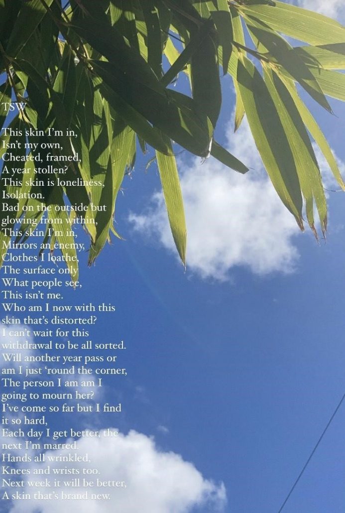 “I have been going through TSW for almost a year and a half now and art has really played a huge part in helping me to feel normal and helping me feel like I can actually accomplish something. I wrote a poem about TSW and I have been painting recently. I will share both the poem and some artwork I’m proud of. Thank you always for bringing the community together in hard times.” -Sasha Bailey