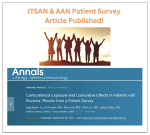 Thank you to the eczema and TSW communities who took the survey in late 2020/early 2021 that was developed by ITSAN and the Allergy Asthma Network (AAN). You are part of bringing change and making history! Kathryn Tullos, ITSAN President and Kelly Barta, ITSAN Executive Board Member and President of the Coalition of Skin Diseases, are among the authors of the recently published article in the Annals of Allergy, Asthma & Immunology, “Corticosteroid Exposure and Cumulative Effects in Patients with Eczema: Results from a Patient Survey.” Collaborating authors were Dr. Luz Fonacier, Dr. Peter Lio, Dr. Belinda Sheary, as well as Mary Hart and Tonya Winders of Allergy Asthma Network. Read more here.
