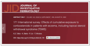 Kathryn Tullos, ITSAN President and Kelly Barta, ITSAN Executive Board Member and President of the Coalition of Skin Diseases, are among the authors of a recently published abstract in the Journal of Investigative Dermatology, “International Survey: Effects of Cumulative Exposure to Corticosteroids in Patients with Eczema, Including Topical Steroid Withdrawal Syndrome (TSWS). Read more here.