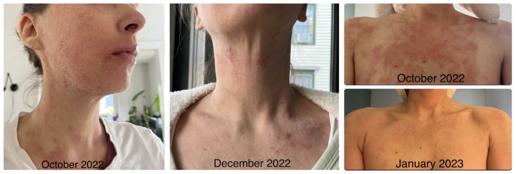 Results from the skin prick allergy tests indicated environmental triggers included mold, dog, and just about every tree (the latter explained my yearly springtime suffering), and I began sublingual immunotherapy to treat my allergies. My lab results, on the other hand, came back normal, except for elevated IgE. Six months into spreading rashes on my face and upper body, numbness, tingling, and cycling red hot areas of the skin, I hit a breaking point. With ten doctors’ appointments behind me, I was still sick, and I found myself bedridden on a beach vacation – nauseated, with bright red, burning circular patches on my cheeks.