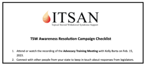 • Watch the video “TSW Advocacy Training: TSW Awareness Resolution Campaign” with Kelly Barta, ITSAN Executive Board Member, for the tools you need to get a TSW Resolution passed in your state or province.