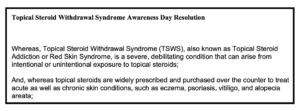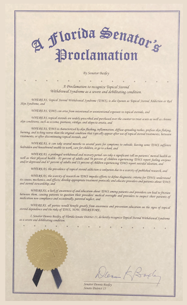 This piece of legislation established a TSW Awareness Day in the state of Florida, and serves as a supportive document for our community in acknowledging the existence of TSW Syndrome, and the great need for research around the condition. Having a resolution passed in your state or province provides a credible source to bring to doctors who may not be supportive or aware of TSW Syndrome. It will help bolster efforts to gain recognition in the medical world and push forward work to address the need for product label changes and education around the proper use of topical steroids and their associated risks.